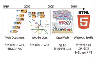 그리고 마지막 네 번째 단계는 2010년 이후부터 현재까지로, 스마트폰 및 태블릿 등 다양한 모바일 기기들을 대상으로 HTML5와 web API를 통해 한 단계 진화된 웹 응용 환경을 제공하며 위치 정보 및 소셜 정보 등을 결합하는 통합 응용 플랫폼으로서 웹이 자리잡아 가는 단계라 할 수 있습니다. 이러한 웹 기술은 웹 마크업 기술을 기반으로 웹 애플리케이션 기술, 그리고 웹 플랫폼 기술로 진화하고 있습니다.