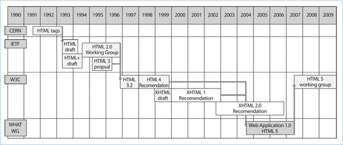 웹 기술이 확산된 가장 큰 배경은 HTML이라는 장치 독립적 표현 언어를 이용하여 정보를 표현하고, 이를 다양한 단말에서 브라우저라는 응용 프로그램으로 접속하여 활용할 수 있게 함으로써, 언제 어디서는 표준 브라우저만 있으면 웹을 사용할 수 있다는 단말 플랫폼 비종속적인 장점을 가질 수 있었기 때문입니다. 그림과 같이 1993년 HTML 1.0 규격이 만들어지고 난 후, 1997년 HTML 4.0과 1999년의 HTML 4.01 규격이 만들어지기까지 웹 기술은 폭발적으로 성장하였지만, HTML 자체가 갖는 확장의 어려움으로 W3C에서는 1999년부터 좀 더 다양한 확장성을 가질 수 있도록 하기 위해 XML을 기반으로 하는 새로운 XHTML(Extensible Hypertext Markup Language) 1.0 개발을 추진하였고, 2009년까지 XHTML 2.0 개발을 진행하여 왔습니다.