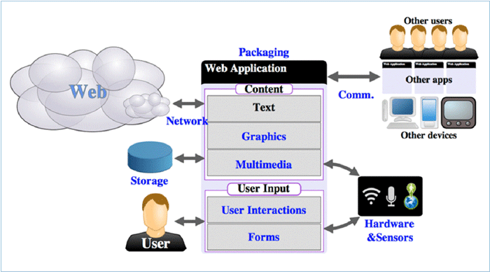 웹 애플리케이션을 위한 W3C의 표준들은 위의 그림과 같이 단순한 문서 표현의 수준을 넘어, 위젯과 같은 패키징 기능, 네트워크 및 커뮤니케이션 기능, 센서 및 하드웨어 제어 기능, 스토리지 및 파일 제어 기능, 사용자 인터액션 기능 등 거의 모든 기능을 웹 기반으로 처리하기 위한 표준 규격이 개발되고 있습니다.