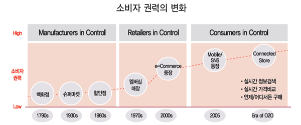1900년대 초반, 소수의 생산자가 공장에서 상품을 제조, 판매하는 과정에 깊이 개입하던 시기에는 소비자 권력이 거의 존재하지 않았습니다. 여러 상품 중에서 비교를 통해 한 가지를 골라 구매한다는 개념은 상상할 수 없었고, 상품 선택의 폭과 구매 방식은 제한적이었습니다. 상품이 거래되는 주요 채널도 오프라인 매장에 한정되어 있었습니다.