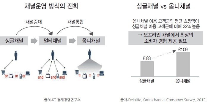 특히 대형 오프라인 유통업체들의 경우, 제품이 판매되는 채널의 종류보다 고객들이 자사의 채널을 이용한다는 사실이 더 중요하게 되었습니다. 즉, 채널을 독립적으로 운영하던 방식(싱글채널·멀티채널)에서 벗어나, 모든 유통 채널을 유기적으로 통합하여 운영하는 시스템(옴니채널)이 중요해졌음을 의미합니다. 실제로 Deloitte 자료(Omnichannel Consumer Survey, 2013)에 따르면, 옴니채널 이용 고객군의 평균 쇼핑액이 싱글채널 이용 고객군에 비해 32% 높은 것으로 나타났습니다. 더불어, 옴니채널의 전략적 기지로써 고객 경험을 제공하기 위한 오프라인 채널의 중요성이 부각되었습니다.