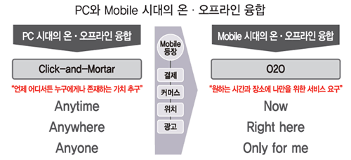 사실 온라인과 오프라인의 연계는 이미 2000년대 초 'Click-and-Mortar' 시대에 경험할 수 있던 것이었습니다. 'Click-and-Mortar'은 오프라인 기반의 전통적인 기업을 칭하는 단어인 'Brick-and-Mortar'과 인터넷을 상징하는 단어인 'Click'의 합성어입니다. 인터넷의 등장으로 발현된 PC 기반의 온·오프라인 융합은 단순히 온·오프라인 간 시너지 확대에 초점이 맞추어져 있었지만, 스마트폰이 확산되고 모바일 시대가 도래하면서 단순 시너지 확대 이상의 가치 창출에 관심이 쏠리기 시작했습니다.