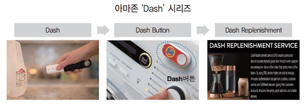 'Dash'는 구매가 필요한 상품명을 IoT 단말에 대고 말하거나 해당 상품의 바코드를 스캔하면 상품을 자신의 온라인 계정에 저장할 수 있습니다. 'Dash Button'은 세제와 같이 자주 소모되며 교체가 빈번한 생필품과 연동된 IoT 단말로, 버튼을 누르면 역시 온라인 계정으로 해당 상품을 등록할 수 있습니다.