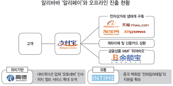 알리바바는 네비게이션 업체 '오토네비', 오프라인 커머스 업체 '인타임리테일'의 지분을 확보하였는데, 이러한 사업 확대는 알리페이 결제를 기반으로 성장시켜온 온라인 사업을 오프라인 영역으로 확장하기 위한 전략으로 볼 수 있습니다.