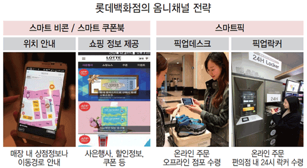 고객의 매장 안내를 도와주는 '스마트 비콘' 서비스와 사은행사·쿠폰 등의 각종 쇼핑 정보를 제공하는 '스마트 쿠폰북' 앱은 서비스는 고객에게 최적화된 오프라인 쇼핑 경험을 제공하기 위해 온라인 채널을 활용하는 전략입니다. 한편, '스마트픽'은 온라인으로 상품을 주문하고 오프라인 점포나 편의점 내 설치된 24시간 락커에서 수령할 수 있게 해주는 서비스입니다. 이는 온라인 주문 후 상품 수령까지의 대기 시간을 해소하며 오프라인 채널을 통해 온라인 쇼핑 경험을 보완하는 역할을 하고 있습니다.