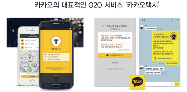 카카오와 같이 고객 기반을 많이 확보하고 있는 플랫폼 사업자들은 자신의 플랫폼에 오프라인 서비스를 붙이면 O2O 서비스 제공이 가능해집니다. 현재 대표적인 O2O 서비스로 활발하게 이용되고 있는 '카카오택시'는 모바일 플랫폼과 택시 운송 서비스가 결합된 O2O 서비스입니다. 카카오택시 모바일 앱을 통해 출발지와 목적지를 지정한 후 택시를 호출하면 나의 위치가 자동으로 파악되어 택시가 배차됩니다. 승차 시 안심메시지 기능도 제공하여 간편하고 안전한 택시 이용이 가능합니다. 카카오택시는 2015년 3월 출시된 이래 누적콜수 2천만 건, 일 평균 호출 24만 건의 성과를 내고 있습니다('15년 9월 기준)
