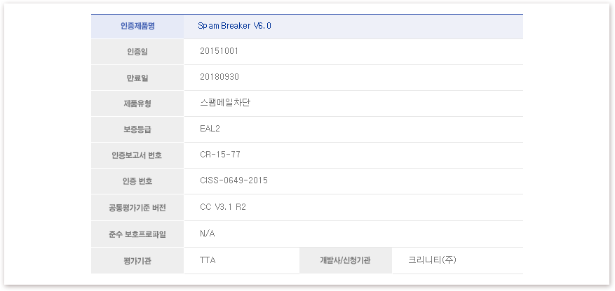 크리니티의 스팸메일 차단시스템'스팸브레이커(SpamBreaker) V6.0'이 IT보안인증사무국으로부터 CC인증 EAL2 등급을 획득했습니다.
