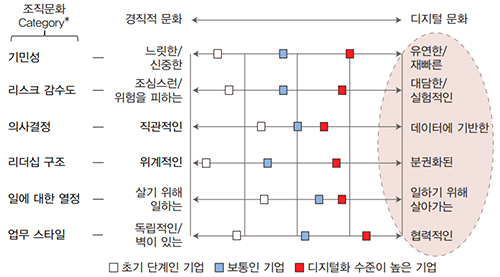 [그림] 기업들의 디지털화 수준별 조직 문화 양상 (출처: LG경제연구원)