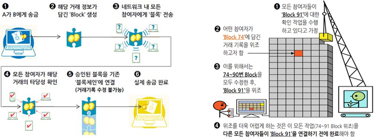 [그림] 블록체인 작동 프로세스 (출처: KB금융지주 경영연구소) [그림] 블록체인 위조가 어려운 이유 (출처: 미래창조과학부 블로그)
